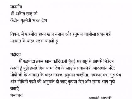 याबाबत एनसीपीच्या कार्यकर्त्या फहमिदा हसन यांनी सांगितले की, त्या पंतप्रधान नरेंद्र मोदींच्या निवासस्थानाबाहेर हनुमान चालिसा पठण आणि दुर्गा पाठ करू इच्छितात. त्याबाबत त्यांनी केंद्रीय गृहमंत्री अमित शाहा यांना पत्र लिहिलं आहे. फहमिदा हसन यांनी सांगितले की, त्या नेहमी आपल्या घरामध्ये हनुमान चालिसा पठण आणि दुर्गा पूजा करतात. मात्र ज्याप्रकारे देशात महागाई आणि बेरोजगारी वाढत आहे. ते पाहून पंतप्रदान नरेंद्र मोदी यांना झोपेतून जागे करण्याची आवश्यता निर्माण झाली आहे. मुख्यमंत्री उद्धव ठाकरे यांच्या निवासस्थानाबाहेर हनुमान चालिसा पठण केल्याने रवी राणा आणि नवनीत राणा यांना महाराष्ट्राचा फायदा दिसत आहे. तर देशाचा फायदा करण्यासाठी पंतप्रधान निवासस्थानी जाऊन हनुमान चालिसा पठण आणि दुर्गापाठ करणे आवश्यक आहे, असा दावा त्यांनी केला.