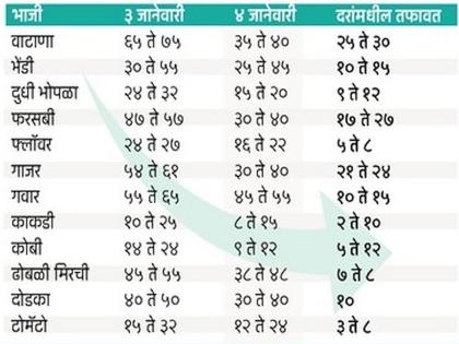 - भेंडीचे दर प्रतिकिलो ३० ते ५५ वरून २५ ते ४५ रुपये किलोवर आले आहेत. दुधी भोपळा २४ ते ३२ वरून १५ ते २० वर आले आहेत. फरसबी ४७ ते ५७ वरून ३० ते ४० रुपयांवर आले आहेत.