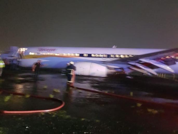 मुंबई विमानतळावर स्पाइस जेटचे विमान धावपट्टीवर उतरत असताना हा प्रकार घडला. मात्र, यामध्ये कुणीही जखमी झाले नाही. सर्व प्रवासी सुखरूप असल्याचे सांगण्यात येत आहे.