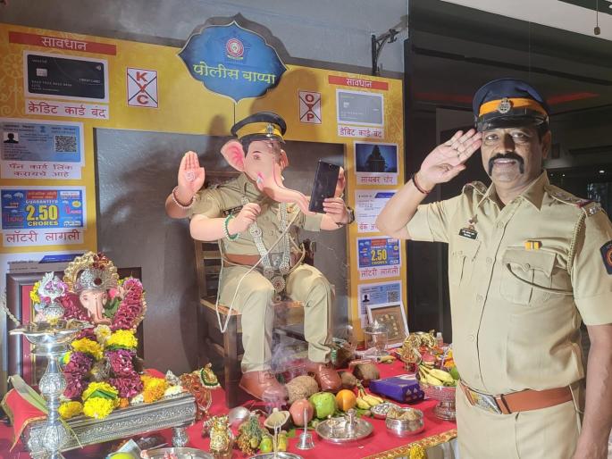 मुंबई-गणेशोत्सव म्हणजे समाजप्रबोधनाचं सर्वात मोठं व्यासपीठ आहे. विलेपार्ले पोलिस ठाण्याचे पोलीस निरीक्षक राजेंद्र काणे यांनी त्यांच्या पार्ल्याच्या घरी सायबर फसवणूकीबद्दल सावध राहा असा संदेश देणारा अनोखा देखावा साकारला आहे. इचलकरंजीचे सुपुत्र राजेंद्र काणे हे गेली पाच वर्षे आपल्या घरी पोलीस रुपात पोलीस बाप्पाची प्रतिष्ठापना करतात. या वर्षी त्यांनी हातात मोबाईल घेतलेल्या बाप्पाची प्रतिष्ठापना केली आहे.