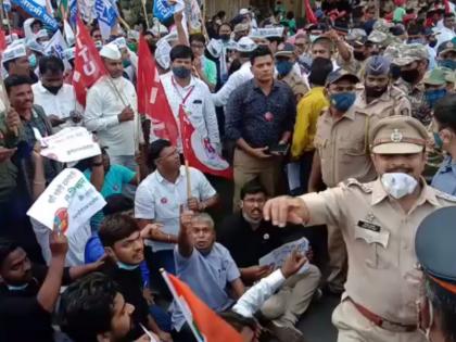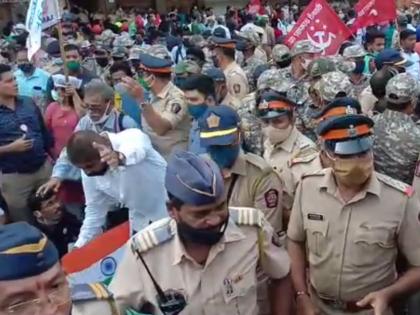 मुंबई : केंद्राच्या कृषी कायद्यांविरोधात किसान सभेनं मोर्चाचं आयोजन केलं आहे. नाशिकहून आलेला मोर्चा सध्या आझाद मैदानात असून थोड्याच वेळात तो राजभवनावर धडकणार आहे. कृषी कायदे रद्द करण्याची मागणी करणारं निवेदन राज्यपाल भगतसिंह कोश्यारी यांना देण्याचा शेतकऱ्यांच्या मानस आहे. मात्र त्यासाठी शेतकऱ्यांना संध्याकाळपर्यंत वाट पाहावी लागू शकते. मात्र, मेट्रो जंक्शन परिसरात पोलिसांनी शेतकऱ्यांना अडविले आहे. काही जण पुढे जाण्याचा प्रयत्न करत आहे. सहपोलीस आयुक्त विश्वास नांगरे पाटील जमावाला समजाविण्याचा प्रयत्न करत आहे. मोर्चाच्या पार्श्वभूमीवर १०० अधिकारी ५०० अंमलदारांचा अतिरिक्त फ़ौजफाटा तैनात आहे. तसेच एसआरपीएफच्या ९ तुकडया त्यांच्या मदतीला तैनात असून ड्रोनद्वारे सर्व हालचालींवर सुरक्षा यंत्रणा लक्ष ठेवून आहेत.