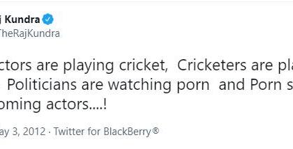 राज कुंद्रा यांचं याच संदर्भातील आणखी एक ट्विट चर्चेचा विषय ठरत आहे. ३ मे २०१२ रोजी राज यांनी केलेल्या ट्विटनं सोशल मीडियात जोरदार चर्चा झाली होती. "भारतात अभिनेते क्रिकेट खेळत आहेत, क्रिकेटपटू राजकारणात येत आहेत, राजकारणी पोर्न पाहत आहेत आणि पोर्न स्टार्स अभिनयाच्या क्षेत्रात येत आहेत", असं ट्विट राज कुंद्रा यांनी केलं होतं.