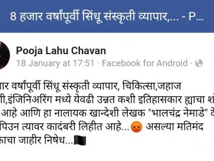 पूजा या पोस्टमध्ये म्हणाली होती की, आठ हजार वर्षांपूर्वी सिंधू संस्कृती व्यापार, चिकित्सा, जहाज बांधणी, इंजिनिअरिंगमध्ये एवढी उन्नत कशी होती, याचा शोध इतिहासकार घेत आहेत. मात्र खान्देशी लेखक "भालचंद्र नेमाडे" हे देशी दारू पिउन त्यावर कादंबरी लिहीत आहेत. असल्या मतिमंद लेखकाचा जाहीर निषेध. असे तिने आपल्या शेवटच्या फेसबूक पोस्टमध्ये म्हटले होते. पूजा चव्हाणने ही पोस्ट १८ जानेवारी रोजी संध्याकाळी फेसबूकवर शेअर केली होती.