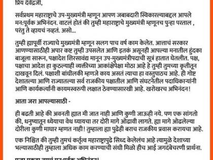 राज ठाकरे या पत्रात म्हणतात की, सर्वप्रथम महाराष्ट्राचे उपमुख्यमंत्री म्हणून तुम्ही जबाबदारी स्वीकारलीत त्याबद्दल तुमचं मन:पूर्वक अभिनंदन. वाटलं होतं की, तुम्ही महाराष्ट्राचे मुख्यमंत्री म्हणूनच परत याल. परंतु, ते व्हायचं नव्हतं, असो...
