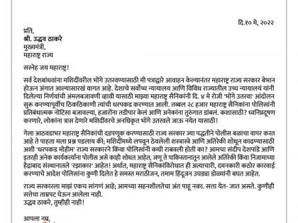 मुख्यमंत्र्यांना लिहिलेल्या पत्रात राज ठाकरे म्हणाले की, सर्व देशबांधवांना मशिदीवरील भोंगे उतरवण्यासाठी मी पत्राद्वारे आवाहन केल्यानंतर महाराष्ट्र सरकार बेभान होऊन, अंगात आल्यासारखं वागत आहे. देशाचे सर्वोच्च न्यायालय आणि विविध राज्यांमधील उच्च न्यायालयांनी दिलेल्या निर्णयाची अंमलबजावणी व्हावी, यासाठी माझ्या महाराष्ट्र सैनिकांनी ४ मे रोजी भोंगे उतरवा आंदोलन करण्यापूर्वीच त्यांची धरपकड करण्यात आली. तब्बल २८ हजार मनसैनिकांना पोलिसांनी प्रतिबंधात्मक नोटिसा बजावल्या. हजारोंना तडिपार केलं आणि अनेकांना तुरुंगात डांबलं. कशासाठी? ध्वनिप्रदूषण करणारे, लोकांना त्रास देणारे मशिदींवरचे अनधिकृत भोंगे उतरवले जाऊ नयेत यासाठी, असा टोला राज ठाकरे यांनी लगावला.
