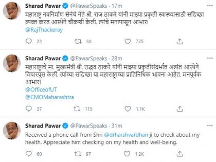 मनसे अध्यक्ष राज ठाकरे यांनीही शरद पवार यांच्या प्रकृतीची आस्थेनं विचारपूस केली. याबाबत, स्वत: शरद पवार यांनी ट्विटरवरुन माहिती दिली. तसेच, राज यांच्यासह सर्वांचे मनापासून आभार मानले आहेत. आपल्या सर्वांच्या सदिच्छा माझ्यासोबत आहेत, असेही पवार यांनी म्हटलं.