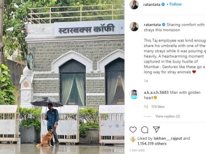 टाटांनी इंस्ट्राग्राम अकाऊंटवरुन शेअर केलेल्या फोटोत ताज हॉटेलमधील एक कर्मचारी कुत्र्याच्या डोक्यावर छत्री धरुन उभा असल्याचं दिसतं. 'ताजचा हा कर्मचारी अतिशय दयाळू आहे. त्यानं आपली छत्री भटक्या कुत्र्यासोबत शेअर केली आहे. मुंबईचा पाऊस मुसळधार असूनही त्यानं प्राणीमित्राची दया दाखवली. मुंबईच्या धावपळीच्या जीवनात मनाला स्पर्श करून जाणारा एक क्षण कॅमेऱ्यात कैद झाला आहे. प्राण्यांप्रतीचा हा जिव्हाळा सदसर्वकाळ राहो,' असे रतन टाटा यांनी म्हटले आहे.