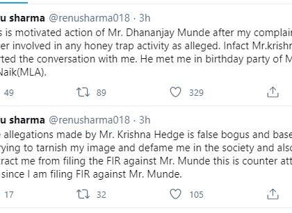 रेणू शर्मा यांनी मला देखील रिलेशनशिपच्या हनीट्रॅपमध्ये ओढण्याचा प्रयत्न केला होता, असा आरोप भाजप नेते आणि माजी आमदार कृष्णा हेगडे यांनी केला आहे. त्यावर रेणू शर्मा यांनी हेगडेंचे आरोप बोगस असल्याचं म्हटलं आहे. "कृष्णा हेगडे यांनी माझ्यावर केलेले आरोप हे खोटे आणि बिनबुडाचे आहेत. धनंजय मुंडे यांच्याविरोधात दाखल केलेल्या तक्रारीत आडकाठी आणण्याचा प्रयत्न केला जात असून माझी प्रतिमा मलिन करण्याचा प्रयत्न केला जात आहे", असं रेणू शर्मा यांनी ट्विटमध्ये म्हटलं आहे.