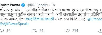 राज्य सरकारच्या या मेगभऱती प्रकियेला कर्जत-जामखेडचे आमदार रोहित पवार यांनी आक्षेप घेतला आहे. तसेच, महाविकास आघाडी सरकार आणि मुख्यमंत्री उद्धव ठाकरेंना आवाहनही केलंय. ''राज्यात खासगी एजन्सीद्वारे नोकर भरती करण्याचा घाट घालून तरुणांच्या भवितव्याचा खेळखंडोबा करण्याचा प्रकार मंत्र्यांची दिशाभूल करण्याच्या काही अधिकाऱ्यांच्या खेळामुळे होत आहे. केरळसारख्या राज्याला राज्य लोकसेवा आयोगामार्फत नोकर भरती करता येते तर महाराष्ट्राला ते का शक्य होऊ नये?'', असे रोहित पवार यांनी आपल्या ट्विटर अकाऊंटवरुन म्हटले आहे.