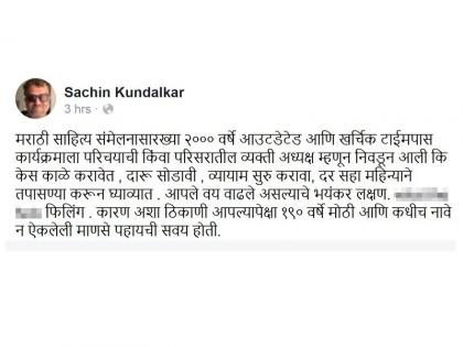 ''मराठी साहित्य संमेलनासारख्या 2000 वर्षे आऊटडेटेड आणि खर्चिक टाईमपास कार्यक्रमाला परिचयाची किंवा परिसरातील व्यक्ती अध्यक्ष म्हणून निवडून आली की केस काळे करावेत, दारू सोडावी, व्यायाम सुरू करावा, दर सहा महिन्याने तपासण्या करून घ्याव्यात . आपले वय वाढले असल्याचे भयंकर लक्षण. what the *** फिलिंग. कारण अशा ठिकाणी आपल्यापेक्षा १९० वर्षे मोठी आणि कधीच नावे न ऐकलेली माणसे पाहायची सवय होती'', अशी फेसबुक पोस्ट त्यांनी संमेलनाच्या अध्यक्षपद निवडीवरुन अपलोड केली आहे. यामुळे आता नवीन वाद निर्माण होण्याची शक्यता आहे.