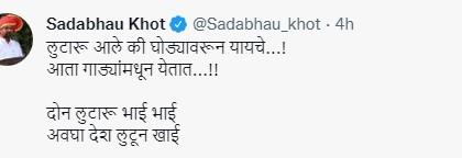रोहित पवार आणि अदानी यांचा गाडीतील फोटो शेअर करत रयत क्रांती संघटनेचे सदाभाऊ खोत यांनी पवार घराण्यावर बोचरी टिका केली. ''लुटारू आले की घोड्यावरून यायचे. आता गाड्यांमधून येतात. दोन लुटारू भाई भाई, अवघा देश लुटून खाई..'' असे ट्विट सदाभाऊ खोत यांनी केले आहे.