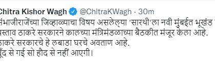 संभाजीराजेंच्या जिव्हाळ्याचा विषय असलेल्या 'सारथी'ला नवी मुंबईत भूखंड देण्याचा प्रस्ताव ठाकरे सरकारने कालच्या मंत्रिमंडळाच्या बैठकीत मंजूर केला आहे. ठाकरे सरकारचे हे लबाडा घरचे अवताण आहे. बूँद से गई सो हौद से नहीं आएगी।, असे ट्विट चित्रा वाघ यांनी केलं आहे. आपल्या ट्विटमधून मराठा आरक्षणाचा प्रश्न प्रलंबित असल्याकडेही त्यांनी लक्ष वेधल्याचे दिसून येते.