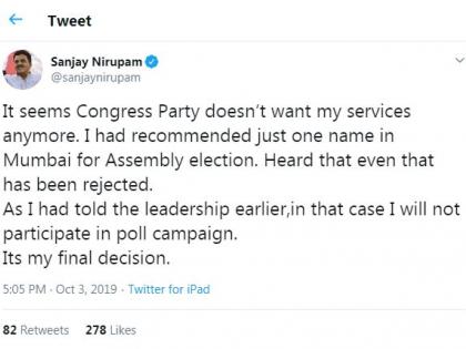 राज्यातील विधानसभा निवडणुकांसाठी काँग्रेसने उमेदवारांच्या तीन याद्या जाहीर केल्या आहेत. या तिन्ही यादीपर्यंत संजय निरुपम यांनी मुंबईतील एका जागेसाठी हट्ट धरला होता. मात्र, पक्षाकडून त्यांच्या शब्दाला केराची टोपली दाखविण्यात आली. त्यामुळे संतप्त झालेल्या संजय निरुपम यांनी विधानसभा निवडणुकांमध्ये कुठलाही प्रचार करणार नसल्याचे म्हटले आहे. तसेच पक्षाच्या प्रचार अभियानातही मी सहभागी होणार नसल्याचे निरुपम यांनी सांगितले. निरुपम यांनी आपल्या ट्विटर अकाऊंटवरुन एक ट्विट केले आहे. त्यामध्ये, मी पक्षाकडे मुंबई शहरासाठी एका जागेची मागणी केली होती. मात्र, काँग्रेसच्या तिनही याद्यांमध्ये निरुपम यांच्या शब्दाला मान देण्यात आला नाही. मी देलेली नावे नाकारण्यात आली आहेत. त्यामुळे कदाचित काँग्रेस पक्षाला माझं कामं, सेवा नको आहे, असेच मला वाटते. त्यामुळे मी पक्षाच्या प्रचार अभियानात सहभागी होणार नसल्याचे निरुपम यांनी म्हटले आहे.