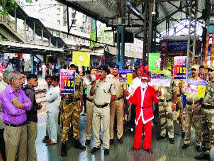 मुंबई : रेल्वे प्रवासाबाबत प्रवाशांमध्ये जनजागृती करण्यासाठी घाटकोपर रेल्वे स्थानकात सोमवारी सांताक्लॉजचे आगमन झाले होते. रेल्वे पोलिसांतर्फे या उपक्रमाचे आयोजन करण्यात आले होते. यावेळी रेल्वे सुरक्षेबाबत माहिती देणारे फलक हातात घेऊन सांताक्लॉज रेल्वे प्लेटफॉर्म, तसेच रेल्वे ब्रिजवर उभा होता. रेल्वे ट्रॅक ओलांडू नका, नेहमी रेल्वे फूटओवरब्रिजचा उपयोग करा, रेल्वेमध्ये चढताना व उतरताना दरवाजाच्या डाव्या बाजूचा उपयोग करावा, दरवाजाला लटकून प्रवास करू नका, रेल्वे पोलिसांच्या मदतीसाठी १८२ क्रमांकावर फोन करावा. अशा घोषणा रेल्वे पोलिसांमार्फत देण्यात येत होत्या. रेल्वे सुरक्षेबाबत सांताक्लॉज जनजागृती करत असल्याने प्रवाशांचे लक्ष वेधले जात होते. यावेळी रेल्वेचे नियम न पाळल्यास कोणत्या प्रकारची कारवाई होऊ शकते, याबद्दल प्रवाशांना माहिती देण्यात आली व योग्य उपाययोजनांची अंमलबजावणी करण्याचे आवाहन केले.