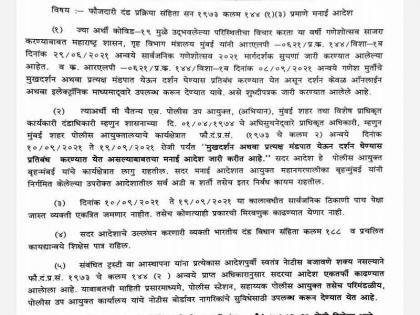 Mumbai Section 144: पुण्यापाठोपाठ आता मुंबईतहीजमावबंदीचे आदेश लागू करण्यात आले आहेत. मुंबई पोलिसांनी पुढील ९ दिवस शहरात कलम १४४ लागू केलं आहे. त्यामुळे पुढील ९ दिवस आता सार्वजनिक ठिकाणी ५ पेक्षा जास्त लोकांना एकत्रित जमण्यास बंदी आहे. मुंबई पोलिसांकडून याबाबतचे आदेश जारी करण्यात आले आहेत. पोलिसांच्या आदेशानुसार आता गणेशोत्सव काळात कोणत्याही मिरवणुकांना परवानगी नसेल. यासोबतच राज्य सरकारनं जाहीर केलेल्या नियमावलीनुसार प्रत्यक्ष मुखदर्शनास प्रतिबंध करण्यात आली असल्यानं नागरिकांना दर्शनासाठी गर्दी न करण्याचं आवाहन करण्यात आलं आहे. अन्यथा कारवाई केली जाणार असल्याचंही स्पष्ट करण्यात आलं आहे.