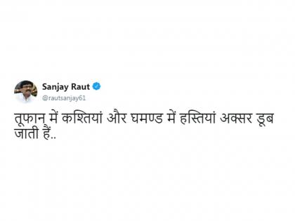 संजय राऊत यांनी ट्विटमध्ये म्हटलं आहे की, तूफान में कश्तियां और घमण्ड में हस्तियां अक्सर डूब जाती हैं असं म्हणत भाजपावर अप्रत्यक्षपणे टीका केली आहे.
