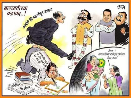 राज ठाकरेंच्या याच व्यंगचित्राला प्रत्युत्तर देणारं व्यंगचित्र सोशल मीडियावर व्हायरल झालं आहे. 'बारामतीच्या बळावर' असं शीर्षक या व्यंगचित्राला देण्यात आलं आहे. यामध्ये राज ठाकरे व्यंगचित्र रेखाटताना दाखवण्यात आले आहेत. राज ठाकरे फक्त व्यंगचित्रात मग्न असल्यानं त्यांच्याकडे पक्षाकडे पाहायला वेळ नाही. त्यामुळे मनसेचे नेते पक्षाला रामराम करत आहेत, असं व्यंगचित्रात दाखवण्यात आलं आहे. 'हम व्यंगचित्र बनाते रहे, और लोग हमसे दूर जाते रहे,' अशी ओळ व्यंगचित्रातील राज यांच्या पाठीवर आहे. मनसेतून बाहेर पडणाऱ्या नेत्यांचं शिवसेनेचे पक्षप्रमुख उद्धव ठाकरे स्वागत करत असल्याचं या चित्रात दिसतं आहे. उद्धव ठाकरेंच्या बाजूला मुख्यमंत्री देवेंद्र फडणवीस उभे असल्याचं व्यंगचित्रात दाखवण्यात आलं आहे. सध्या या व्यंगचित्राची सोशल मीडियावर जोरदार चर्चा आहे.