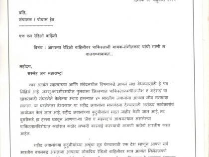 संगीत ऐकणा-याच्या मनात प्रेमाची भावना निर्माण होते हे खरं असलं तरी सध्याच्या संवेदनशील स्थितीत पाकिस्तानी गायक-संगीतकारांची गाणी मात्र देशवासीयांच्या मनात संतापाची भावना निर्माण करत आहेत. म्हणूनच रेडिओ वाहिन्यांवर पाकिस्तानी गायक-संगीतकारांची गाणी वाजवली जाऊ नयेत, अशी प्रत्येक भारतीयाची इच्छा आहे.”