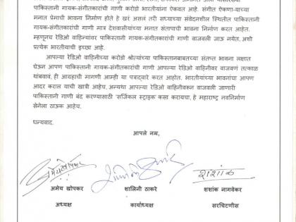 पाकिस्तानी गायक-संगीतकारांची गाणी आपल्या रेडिओ वाहिनीवर वाजवणं तत्काळ थांबवावं, अशी मागणी मनसेनं पत्राद्वारे केली आहे. भारतीयांच्या भावनांचा आपण आदर कराल याची खात्री आहेच, अन्यथा आपल्या रेडिओ वाहिनीवरून वाजवली जाणारी पाकिस्तानी गाणी बंद करण्यासाठी ‘सर्जिकल स्ट्राइक’ कसा करायचा, हे महाराष्ट्र नवनिर्माण सेनेला ठाऊक आहेच, असा इशाराही शालिनी ठाकरे यांनी दिला आहे.