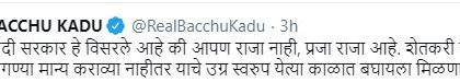 बच्चू कडू यांनी शेतकरी आंदोलनाचा प्रश्न न सुटण्याला पंतप्रधान नरेंद्र मोदींचा हेकेखोरपणाच कारणीभूत असल्याचं म्हटलंय. ''26 जानेवारी हा प्रजासत्ताक दिन आहे, किमान या दिवशीतरी पंतप्रधानांनी प्रजेचं ऐकून निर्णय घ्यावा. आपण राजा नसून प्रजा हीच राजा आहे, असेही कडू यांनी म्हटलंय. मोदी सरकार हे विसरले आहे की आपण राजा नाही, प्रजा राजा आहे. शेतकरी राजाच्या मागण्या मान्य कराव्या नाहीतर याचे उग्र स्वरुप येत्या काळात बघायला मिळणार,'' असा इशाराही कडू यांनी मोदी सरकारला दिला आहे.