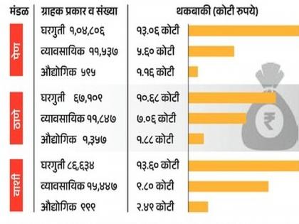 २,५८,५४९ घरगुती ग्राहकांची थकबाकी ३७.३३ कोटी आहे. ३८,८३१ व्यावसायिक ग्राहकांची थकबाकी २२.४७ कोटी आहे तर २,९५१ औद्योगिक ग्राहकांची थकबाकी ५.५४ कोटी आहे. मार्च २०२६ मध्ये आतापर्यंत २७,८१७ लघुदाब ग्राहकांचा वीजपुरवठा वीजबिल न भरल्यामुळे खंडित करण्यात आला आहे.