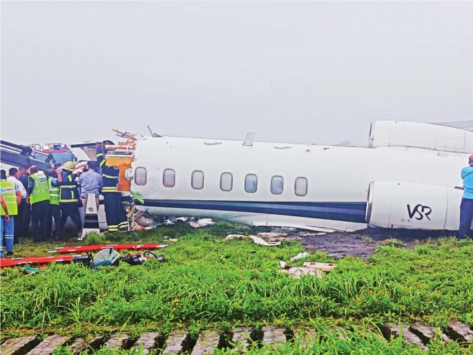 - मनाेज गडनीसमुंबई - मुसळधार पावसात मुंबईविमानतळावर उतरण्याच्या प्रयत्नात असलेले एक छोटे विमान (चार्टर्ड) गुरुवारी सांयकाळी पाच वाजून दाेन मिनिटांनी घसरले. धावपट्टीवरून घसरून हे विमान बाजूच्या गवतात जाऊन आदळले. हा आघात इतका जबरदस्त होता की विमान आदळल्यावर त्याचे दोन तुकडे झाले. यावेळी विमानात २ कर्मचारी व ६ प्रवासी होते. यापैकी तीन प्रवासी जखमी झाले असून त्यांना अंधेरीच्या क्रिटीकेअर रुग्णालयात दाखल करण्यात आले आहे. त्यांची प्रकृती ठीक असली तरी त्यांना मोठा मानसिक धक्का बसल्याचे डॉक्टरांनी सांगितले.