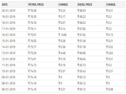 Petrol and diesel prices at Rs 70.95/litre (increase by Rs 0.23) & Rs 65.45/litre (increase by Rs. 0.29), respectively in Delhi. Petrol and diesel prices at Rs 76.58/litre (increase by Rs. 0.23) & Rs 68.53/litre (increase by Rs. 0.31), respectively in Mumbai. pic.twitter.com/qra9C6i9wQ