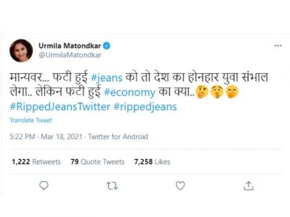"फाटलेली जीन्स राज्यातील कर्तबगार युवा नक्की सांभाळतील. पण फाटलेल्या अर्थव्यवस्थेचं काय करणार?", असा खोचक सवाल उर्मिला मातोंडकर यांनी उपस्थित केला आहे.
