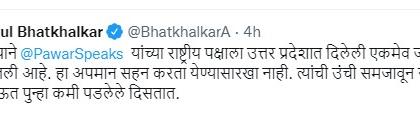 भाजप नेते अतुल भातखळकर यांनी ट्विट करुन उत्तर प्रदेशात समाजवादी पक्षाने राष्ट्रवादीचा अपमान केल्याचे म्हटले आहे. सपाने शरद पवार यांच्या राष्ट्रीय पक्षाला उत्तर प्रदेशात दिलेली एकमेव जागा परत घेतली आहे. हा अपमान सहन करता येण्यासारखा नाही. त्यांची उंची समजावून सांगण्यात राऊत पुन्हा कमी पडलेले दिसतात, असे खोचक ट्विट भातखळकर यांनी केले आहे. या ट्विटला भातखळकर यांनी एक मीडियाचे ट्विट रिशेअर करत त्यातील वृत्ताचा दाखला दिला आहे.