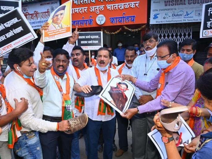 मुंबई - सोशल मीडियावर स्वातंत्र्यवीर सावरकरांची बदनामी करणाऱ्या ऊर्जामंत्री नितीन राऊत यांच्याविरुद्ध मुंबई भाजपा प्रभारी व कांदिवली पूर्व विधानसभा मतदार संघाचे आमदार अतुल भातखळकर यांच्या नेतृत्वाखाली आज कंदिवलीत ‘जोडे मारो’ आंदोलन करण्यात आले. कांदिवली पूर्व येथील भाजपा कार्यालयासमोर नितीन राऊत यांच्याविरुद्ध ‘जोडे मारा’ आंदोलन करण्यात आले. कार्यकर्त्यांनी जोरदार घोषणाबाजी करून राऊत यांच्याविरुद्ध संताप व्यक्त केला.