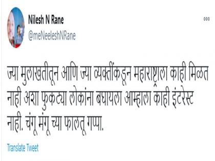 निलेश राणे ट्विट करत म्हणाले की, ज्या मुलाखतीतून आणि ज्या व्यक्तींकडून महाराष्ट्राला काही मिळत नाही, अशा लोकांना बघायला आम्हाला काही इंटरेस्ट नाही. चंगू मंगू च्या फालतू गप्पा, असं म्हणत निलेश राणेंनी उद्धव ठाकरे आणि संजय राऊतांवर निशाणा साधला आहे.