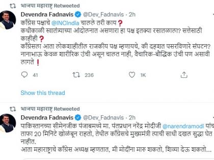 कधीकाळी स्वातंत्र्याच्या आंदोलनात असणारा हा पक्ष इतक्या रसातळाला, सत्तेसाठी काहीही❓. काँग्रेसला आता लोकशाहीतील राजकीय पक्ष म्हणायचे, की दहशत पसरविणारे संघटन?, असा सवाल देवेंद्र फडणवीस यांनी विचारला आहे. तसेच, नानाभाऊ केवळ शारीरिक उंची असून चालत नाही, वैचारिक-बौद्धिक उंची पण असावी लागते, अशा शब्दात देवेंद्र फडणवीस यांनी नाना पटोले यांच्यावर टीका केलीय.