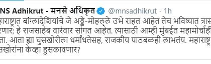 ''महाराष्ट्रात बांग्लादेशियांचे जे अड्डे-मोहल्ले उभे राहत आहेत तेच भविष्यात त्रासदायक ठरणार; हे राजसाहेब वारंवार सांगत आहेत. त्यासाठी आम्ही मुंबईत महामोर्चाही काढला होता. आता ह्या घुसखोरीला धर्मांधतेसह, राजकीय पाठबळही लाभतंय. महाराष्ट्र सरकार ह्या घुसखोरांना केव्हा हुसकावणार?'', असा सवाल मनसेनं महाविकास आघाडी सरकारला विचारला आहे. मनसेनं यापूर्वीही बांग्लादेशी घुसखोरांविरुद्ध आपली भूमिका मांडताना एनआरसी कायद्याचं समर्थन केलं होतं.