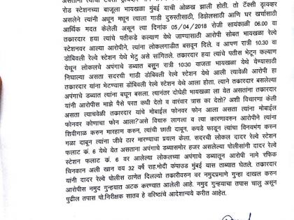 5 एप्रिल रोजी घडलेली ही घटना आहे. त्यादिवशी संध्याकाळी सहा वाजेच्या सुमारात पीडित महिला व आरोपी भायखळा स्टेशनवर भेटले होते. महिला तिच्या पतीला भेटायला कल्याणला जात होती. आरोपीने तिला संध्याकाळी ट्रेनमध्ये बसवलं व रात्री साडेदहा वाजता डोंबिवली स्टेशनला भेटण्याचं सांगितलं. ठरल्याप्रमाणे महिला ट्रेनमध्ये बसली. कल्याणहून येताना ती अपंगांच्या डब्यात बसली. आरोपीही त्याच डब्यात बसला. ट्रेनमध्ये बसल्यावर पीडित महिलेने आरोपीकडे पैसे परत मागितले. तसंच त्रास का देतो, अशी विचारणा केली. त्याच वेळी महिलेच्या मोबाइलवर फोन आला. यानंतर आरोपीने महिलेला कोणाचा फोन आला, असं विचारत मारहाण करायला सुरूवात केली, अशी माहिती दादर पोलीस ठाण्याचे वरिष्ठ पोलीस निरिक्षक नितीन बोबडे यांनी प्रसिद्धी पत्रक जाहीर करून दिली आहे.