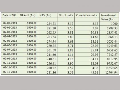 एक सोपे उदाहरण घेऊया समजा एखाद्या गुंतवणूकदाराने दरमहा एक हजार रुपयाची एसआयपी केली आहे आणि म्युच्युअल फंडाचा दर 15 रुपये आहे म्हणजेच NAV 15 रुपये आहे तर त्याला एका महिन्यात सहासष्ट युनिट मिळतील समजा पुढच्या महिन्यात शेअर बाजार कोसळला आणि NAV 12 रुपये झाली तर त्याला त्या महिन्यात 84 युनिट मिळतील म्हणजेच NAV कमी तेवढे युनिट जास्त आणि आणि NAV जसजशी वाढत जाईल तसे त्याचे मार्केट रिटर्न सुद्धा वाढत जातील.