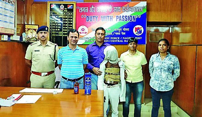 भय्या साठे (५२) रा. सिद्धार्थनगर, बल्लारशा, जि. चंद्रपूर असे आरोपीचे नाव आहे. तो रेल्वेगाडी क्रमांक १२६८८ डेहराडूून-मदुराई एक्स्प्रेसच्या मागील जनरल कोचमधून प्रवास करीत होता. ही गाडी दुपारी १२ वाजता प्लॅटफार्म क्रमांक २ वर येताच आरपीएफचे वरिष्ठ विभागीय सुरक्षा आयुक्त ज्योती कुमार सतीजा यांच्या मार्गदर्शनाखाली उपनिरीक्षक कृष्णा नंद राय, विकास शर्मा, उषा तिग्गा यांनी त्याची तपासणी केली असता त्याने शरीरालाच दारूच्या बॉटल्स सेलोटेपच्या साह्याने गुंडाळल्याचे लक्षात आले. लगेच त्यास अटक करून आरपीएफ ठाण्यात आणण्यात आले. चंद्रपूर आणि वर्धा जिल्ह्यात दारूची तस्करी करण्यासाठी आरोपी नानाविध शक्कल लढवीत असून यापूर्वीही तस्करांनी कपड्याचे बॉक्स, प्रसाधनगृह, महिलांचा वापर करणे, मिठाई बॉक्स, महाविद्यालयीन तरुणी आदींच्या माध्यमातून दारूची तस्करी केल्याचे उघड झाले आहे. वर्षभरात अशा पद्धतीने तस्करी करण्यात येणाºया लाखो बॉटल्स आरपीएफने पकडल्या आहेत.