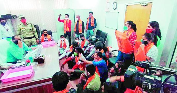सद्यस्थितीत नागपुरात ‘कोरोना’ अक्षरश: थैमान घालत आहे. अशास्थितीत प्रत्येकाला ‘फिजिकल डिस्टन्सिंग’ पाळणे अनिवार्य करण्यात आले आहे. मात्र ‘अभाविप’च्या कार्यकर्त्यांनी यासंदर्भातील नियम न पाळता परीक्षा भवनात प्रवेश केला.