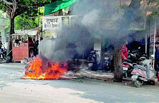 नागपूर : कडक उन्हामुळे नागरिक हैराण झाले असताना बुधवारी दक्षिण नागपुरातील महाकाली चौकात उन्हात रस्त्यावर उभ्या असलेल्या दुचाकीने पेट घेतला अन् पाच मिनिटांत ही दुचाकी जळून खाक झाली.