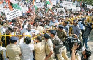 जिल्हाधिकारी कार्यालयावर धडक : पंतप्रधान मोदींच्या पुतळ्याचे दहन नागपूर : नोटाबंदीच्या विरोधात काँग्रेसने आक्रमक भूमिका घेत शुक्रवारी जिल्हाधिकारी कार्यालयाची घेराबंदी केली. शहर अध्यक्ष विकास ठाकरे यांच्या नेतृत्वात शेकडो कार्यकर्त्यांनी जिल्हाधिकारी कार्यालयावर धडक दिली. जिल्हाधिकारी कार्यालयाचे मुख्य प्रवेशद्वार पोलिसांनी बंद केल्यामुळे कार्यकर्त्यांनी सभोवताल कार्यालयाला घेरले. नोटाबंदी विरोधात नारेबाजी करीत पंतप्रधान नरेंद्र मोदी यांच्या प्रतिकात्मक पुतळ्याचे दहन केले. आंदोलनादरम्यान पोलीस व कार्यकर्त्यांत बाचाबाची झाली. परिस्थिती नियंत्रणात ठेवण्यासाठी पोलिसांना काहीअंशी बळाचा वापर करावा लागला. सकाळी ११.३० च्या सुमारास नोटाबंदी विरोधात घोषणा लिहिलेले फलक घेऊन काँग्रेस कार्यकर्ते जिल्हाधिकारी कार्यालयासमोर जमण्यास सुरुवात झाली. कार्यकर्त्यांची वाढती संख्या पाहून पोलिसांनी जिल्हाधिकारी कार्यालयात जाणारे बाहेरील सर्व प्रवेशद्वार बंद केले. शहर अध्यक्ष विकास ठाकरे, माजी केंद्रीय मंत्री विलास मुत्तेमवार, अ.भा. काँग्रेस समितीचे निरीक्षक डॉ. हिमांशू पटेल आदींनी या द्वारबंदीला विरोध केला. मात्र, पोलीस गेट उघडण्यास तयार नसल्यामुळे कार्यकर्त्यांची पोलिसांसोबत बाचाबाची झाली. यावेळी गेट तोडण्याचा प्रयत्न करणाऱ्या कार्यकर्त्यांना पोलिसांनी पांगविण्याचा प्रयत्न केला. शेवटी जिल्हाधिकाऱ्यांना निवेदन देण्यासाठी १५ पदाधिकाऱ्यांना आत सोडण्यात आले. नोटाबंदी नंतर बँकेच्या व एटीएम समोरील रांगेत नागरिकांचा मृत्यू झाला. यासाठी जबाबदार कोण, सद्यस्थितीत जिल्ह्यातील एटीएम समोरील रांगा संपल्या आहेत का, एटीएममधून पैसे मिळत आहेत का, नसतील तर यासाठी जबाबदार कोण आहे, नोटाबंदीनंतर नागरिकांनी जिल्ह्यातील विविध बँकांमध्ये ५०० व १००० रुपयांच्या किती नोटा जमा केल्या, शहर व जिल्ह्यात कोणत्या बँकेचे किती एटीएम आहेत, यापैकी किती एटीएम २४ तास सुरू आहेत. जिल्ह्यात किती काळा पैसा उघडकीस आला, त्यांची नावे जाहीर करावी, आदी मागण्या निवेदनात करण्यात आल्या. आंदोलनात विशाल मुत्तेमवार, अभिजित वंजारी, उमाकांत अग्निहोत्री, नगरसेवक प्रशांत धवड, संजय महाकाळकर, यशवंत मेश्राम, गजराज हटेवार, राजू व्यास, राजू महाजन, संदेश सिंगलकर, विजय बाभरे, जयंत लुटे, नगरसेविका नयना झाडे, रेखा बाराहाते, विद्या लोणारे, उज्ज्वला बनकर, सरस्वती सलामे, प्रज्ञा बडवाईक, संध्या ठाकरे, आशा कुर्वे, माया घोरपडे, भाऊराव कोकणे, आकाश तायवाडे, प्रकाश फुके, सुधाकर बोरकर यांच्यासह मोठ्या संख्येने कार्यकर्ते उपस्थित होते.(प्रतिनिधी) टोलमाफीच्या धर्तीवर शेतकऱ्यांना मोबदला द्या नो