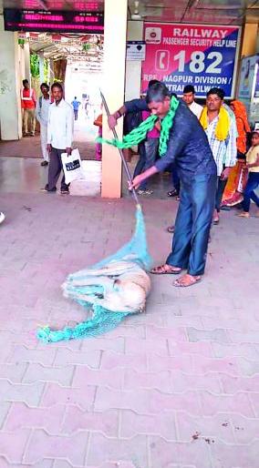 नागपूर रेल्वेस्थानकाच्या पूर्वेकडील संत्रा मार्केट परिसरात मंगळवारी मोकाट कुत्र्यांना जाळी लावून पकडण्यात आले. रेल्वे प्रशासनाने महापालिकेच्या कांजी हाऊस विभागाच्या सहकार्याने हे अभियान राबविले. याबाबत ‘लोकमत’ने सोमवारी ‘कुत्रे गुरगुरतात, लाईटही बंद असतात’ या शीर्षकांतर्गत रेल्वेस्थानकावरील अव्यवस्थेकडे लक्ष वेधले होते. लोकमतमध्ये वृत्त प्रकाशित होतात या वृत्ताची रेल्वे प्रशासनाने गंभीर दखल घेऊन मंगळवारी महापालिकेच्या कांजी हाऊस विभागाच्या पथकास पाचारण केले. पथकाने जाळीच्या साह्याने रेल्वेस्थानकावरील कुत्र्यांना पकडले. यानंतरही ही कारवाई सुरू ठेवण्याचे आश्वासन कांजी हाऊस विभागाने रेल्वे प्रशासनास दिले.