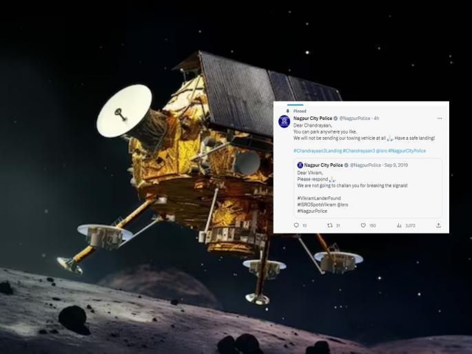 नागपूर पोलिसांकडून चंद्रयान-३ च्या लॅडिंगच्या अगोदरच हे ट्वीट करण्यात आले. ‘डिअर चंद्रयान, तुला वाटेल तेथे तू पार्किंग करू शकतोस. आम्ही कुठल्याही टोईंग वाहनाला अजिबात पाठविणार नाही. सुरक्षित लॅंडिंगसाठी शुभेच्छा असे हे ट्वीट होते. यावर नेटीझन्सनेदेखील एकाहून एक जोरदार कमेंट्स दिल्या. चंद्रयान-२ ची मोहीम अयशस्वी ठरल्यावरदेखील नागपूर पोलिसांनी ट्वीट केले होते. त्यात ‘डिअर विक्रम, कृपया उत्तर दे. आम्ही सिग्नल तोडल्याबाबत तुला चलान करणार नाही, असे ते ट्वीट होते.