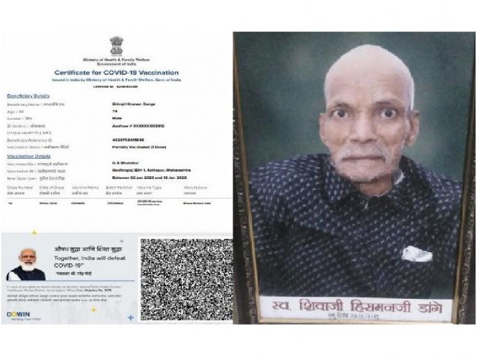 नागपुरातील लालगंज परिसरात राहणारे शिवाजी हिरामन डांगे या मृत व्यक्तीबाबत हा प्रकार घडला आहे. डांगे यांचे २७ जुलै २०२१ ला निधन झाले. त्याला आता दीड वर्ष झाले असताना मृत डांगे यांचा नातू निखिल याच्या मोबाइलवर सोमवारी दुपारी एक मेसेज आला. त्यात शिवाजी हिरामन डांगे यांच्या कोव्हॅक्सिनचा पहिला डोस ५ डिसेंबर २०२२ ला कोल्हापूर जिल्ह्यातील गडहिंग्लज येथे यशस्वीरित्या पूर्ण झाला असल्याचे नमूद होते.