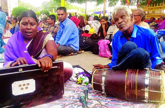 लोकमत न्यूज नेटवर्कनागपूर : कोटी रोग्यांना देऊनी दवा,आला डॉक्टर बनूनी नवा,दिले जीवनदान मेलेल्या जीवा...अशा सोप्या शब्दातील गाण्यातून बाबासाहेबांच्या कार्यांची महत्ती गाऊन उपस्थितांच्या थेट हृदयात साद घातली जात होती. दोन्ही डोळ्यांनी अंध असलेले धम्मानंद मोरे ढोलकीच्या तालावर आणि त्यांच्या पत्नी गंगुबाई पेटीच्या स्वरावर डॉ. बाबासाहेब आंबेडकर यांच्या मानवमुक्तीच्या लढ्याची प्रेरणा, त्यांचे तत्त्वज्ञान आणि मानवमुक्तीचे कार्य जनसामान्यांमध्ये रुजवीत होते.दीनदलितांच्या उद्धाराचा मार्ग खुला करून त्यांना उज्ज्वल भवितव्याची दिशा दाखवणाऱ्या युगनायक डॉ. बाबासाहेब आंबेडकर यांचे विचार गावा-गावापर्यंत पोहचिवण्याचे, समाजमनात रु जविण्याचे मोलाचे कार्य आंबेडकरी जलशांच्या माध्यमामधून झाले. बाबासाहेबांचा परिवर्तनवादी विचार हा या आंबेडकरी जलशांचा प्राण आहे. हीच प्रेरणा घेत जालना जिल्ह्यातील मेठा या गावातील ६० वर्षीय शाहिर धम्मानंद मोरे आणि त्यांच्या पत्नी गंगुबाई ६२ व्या धम्मचक्र प्रवर्तन दिनाच्यानिमित्ताने दीक्षाभूमीवर आले. येथील बोधीवृक्षाखाली बैठक मारली. बुद्ध वंदना घेऊन भीम गीतातून बाबासाहेबांचे विचार पेरायला सुरुवात केली. सूर-तालांच्या आविष्कारात या दोघांचे अंधत्व कुठेच आड येत नव्हते. धम्मानंद मोरे यांची ढोलकीवरील थाप थेट ऐकणाऱ्याच्या हृदयाला साद घालत होती. ‘भल्या भल्यांना माझ्या भीमानं, पहा कसं लाजवलं, भारतीय संविधान माझ्या भीमानं दिल्लीत गाजवलं’ या त्याच्या गाण्यावर तर अनेक जण थिरकलेही.मोरे यांच्याशी संवाद साधला असता ते म्हणाले, तथागत गौतम बुद्ध आणि बाबासाहेबांच्या पुण्याईमुळेच आज गात आहे. आम्हा दोघाना दिसत नसलेतरी ज्येष्ठ कवी वामनदादा कर्डक, विष्णू शिंदे आदींची गाणी तोंड पाठ आहे. दीनदलितांच्या उद्धाराचा मार्ग खुला करून त्यांना उज्ज्वल भवितव्याची दिशा दाखवणाऱ्या युगनायक डॉ. बाबासाहेब आंबेडकर यांचे विचार पोहचविताना मिळणारे समाधान मनाला श्रीमंत करते. असे म्हणत, मोरे यांनी ढोलकीवर थाप देत लोकशाहीर वामनदादा कर्डक यांच्या ‘उद्धारली कोटी कुळे, भीमा तुज्या जन्मामुळे...’गाण्याला सुरुवात केली आणि त्यातच ते तल्लीन झाले.