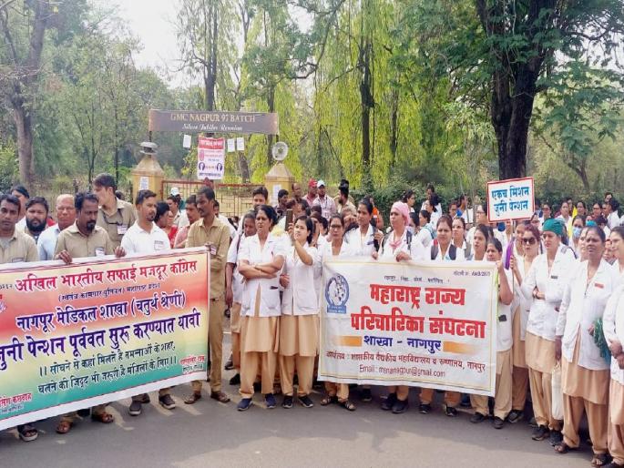 महाराष्ट्र राज्य परिचारिका संघटनेच्यावतीने व राज्य सरकारी कर्मचारी मध्यवर्ती संघटनेच्यावतीने मंगळवारी दुपारी १२ वाजताच्या सुमारास परिचारिकांसह कर्मचाºयांनी एकत्र मोर्चा काढला. अधिष्ठाता कार्यालयासमोर व बाह्यरुग्ण विभागासमोर मोर्चेकरांनी जोरदार नारेबाजी करीत रुग्णालयाचा परिसर दणाणून सोडला.