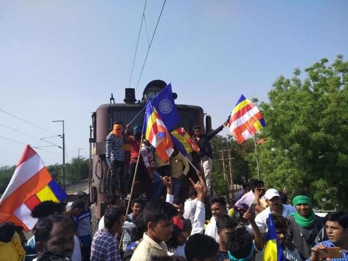 लोकमत न्यूज नेटवर्कनागपूर : दलित संघटनांनी अॅट्रॉसिटी अॅक्टच्या संदर्भात केलेल्या आंदोलनादरम्यान दिल्लीकडे जाणारी तामिळनाडू एक्स्प्रेस सोमवारी दुपारी अर्धा तास रोखुन धरल्यामुळे काही काळासाठी तणाव निर्माण झाला. रेल्वे सुरक्षा दलाने आंदोलकांना बाजूला सारुन ही गाडी पुढील प्रवासासाठी रवाना केली.भारत बंद दरम्यान दलित संघटनांचे कार्यकर्ते नागपुरात आंदोलन करीत होते. दुपारी २.५० वाजता आंदोलक गुरुद्वारा पुलाजवळून जात होते. तेवढ्यात सिग्नल न दिल्यामुळे आऊटरवर थांबलेली मा
