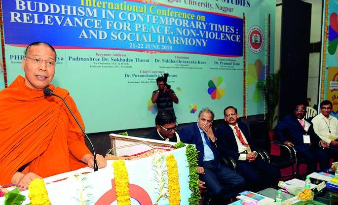 लोकमत न्यूज नेटवर्कनागपूर : चीनच्या मते आमचा बुद्ध धर्म श्रेष्ठ आहे, जपान आणि थायलंडही आमच्याकडून भारताला बुद्धीझम शिकावे लागेल, असे म्हणतो. परंतु जेथे बुद्धाचा जन्म झाला त्या भारत देशाला इतरांकडून बुद्ध शिकण्याची आणि उपदेश घेण्याची गरज नाही, असे प्रतिपादन थायलंड येथील प्रसिद्ध जागतिक बौद्ध विद्यापीठाचे कुलगुरू भदंत फ्रा अनिल शाक्य यांनी केले.राष्ट्रसंत तुकडोजी महाराज नागपूर विद्यापीठाच्या आंतरराष्ट्रीय बौद्ध अध्ययन केंद्रातर्फे आयोजित दोन दिवसीय आंतरराष्ट्रीय बौद्ध परिषदेचे उद्घाटक म्हणून ते बोलत होते. अध्यक्षस्थानी राष्ट्रसंत तुकडोजी महाराज नागपूर विद्यापीठाचे कुलगुरू डॉ. सिद्धार्थविनायक काणे होते. व्यासपीठावर प्रमुख पाहुणे म्हणून विद्यापीठ अनुदान आयोगाचे माजी अध्यक्ष पद्मश्री डॉ. सुखदेव थोरात, कुलसचिव डॉ. पूरणचंद्र मेश्राम, पाली, प्राकृत विभागाचे प्रमुख डॉ. नीरज बोधी उपस्थित होते. भदंत अनिल शाक्य म्हणाले, खरा बुद्ध धर्म हा कुणालाच कळालेला नाही. भगवान बुद्धांनी ज्ञान प्राप्त झाल्यानंतर सारनाथला दिलेल्या उपदेशामुळे रूढी, परंपरा, धर्मवादाला तडा गेला. शांतीसाठी आजकाल परिषदांचे आयोजन करण्यात येते. त्यात खरी शांती नसून प्रत्यक्ष कृती होत नाही. शांती ही जगण्याच्या सर्व वस्तू मिळाल्याशिवाय मिळत नाही. पाश्चात्यांनी अनेक बुद्ध धर्म निर्माण केले. लोकांना बुद्ध धर्मापासून दूर नेण्यासाठी त्यांनी मन कलुषित करण्याला सुरुवात केली. बुद्ध हे शाश्वत सत्य आहे. बुद्ध होणे म्हणजे शाश्वत सत्यापर्यंत पोहोचणे. आपल्याला मिळत असलेल्या मिळकतीपैकी २५ टक्के जवळ ठेवणे, २५ टक्के दान करणे आणि ५० टक्के समाजाला परत करणे हे बुद्धाचे जगण्याचे अर्थशास्त्र आहे. त्यामुळे बौद्ध अध्ययन केंद्रातून खरे बुद्धीस्ट तत्त्वज्ञान शिकविणे ही विद्यापीठाची जबाबदारी असल्याचे त्यांनी सांगितले. विद्यापीठ अनुदान आयोगाचे माजी अध्यक्ष पद्मश्री डॉ. सुखदेव थोरात म्हणाले, सध्या देशात असमानता पसरली आहे. गरीब अधिकच गरीब होत चालला असून श्रीमंत अधिक श्रीमंत होत आहे. त्यामुळे वंचित शोषितांच्या विकासासाठी काम करणे हे प्रत्येकाचे ध्येय असले पाहिजेत. कुलगुरू डॉ. सिद्धार्थविनायक काणे यांनी बुद्धांनी जगाला तारणारे महान तत्त्वज्ञान दिल्याचे सांगून करुणा, शांती, समानता ही मूल्ये जवळपास सर्वच धर्मात समान असल्याचे सांगितले. संचालन डॉ. विकास जांभुळकर यांनी केले. आभार डॉ. नीरज बोधी यांनी मानले. परिषदेला विविध देशातून आलेले प्रतिनिधी मोठ्या संख्येने उपस्थित होते.देशाला पुन्हा धम्मचक्र प्रवर्तनाची गरजसंयुक्त राष्ट्रातर्फे चिरंतन विकासाचा प्रचार-प्रसार करण्यात येत आहे. परंतु च