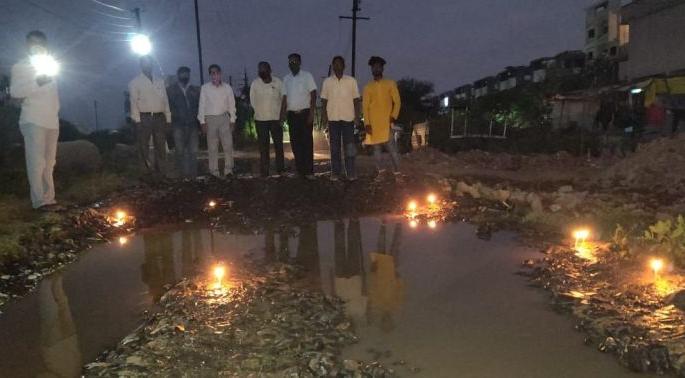 नागपूर : सिटिझन्स फोरमने खड्डेमुक्त नागपूर अभियान सुरु करून शहरातील खराब रस्ते व खड्ड्यांचे फोटो पाठविण्याचे आवाहन नागपूरकरांना करण्यात आले आहे. सोशल मीडियावरील या आंदोलनाला नागपूरकरांनी प्रतिसाद देत १ हजार ५०० खड्ड्यांचे फोटो फोरमकडे पाठविले. यासंदर्भात नागपूर लाईव्ह सिटी अॅप व इतर माध्यमातून मनपाकडे तक्रारी दिल्या. परंतु खड्डे बुजविण्यात आले नाहीत. याच अभियानाचा एक भाग म्हणून नागपूरकरांनी खड्ड्यांभोवती दिवे लावून प्रशासनाचा निषेध नोंदवला.