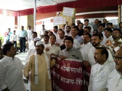 नागपूर - नाणार प्रकल्प मुद्यावरून विधानसभेत शिवसेना पुन्हा आक्रमक झाल्याचे पाहायला मिळत आहे. केवळ शिवसेनाच नाहीतर काँग्रेस व राष्ट्रवादी काँग्रेसनंही नाणार प्रकल्प मुद्यावरुन रिंगणात उडी घेतली आहे. नाणार मुद्यावर चर्चा करण्याची आमदारांकडून मागणी केली जात आहे. यावेळी सभागृहात विरोधकांसह शिवसेनेच्या आमदारांनीही वेलमध्ये उतरुन सरकारविरोधात घोषणाबाजी करण्यात सुरुवात केली. तर दुसरीकडे नाणार प्रकल्पावरुन शिवसेना आणि काँग्रेसमधील आरोप-प्रत्यारोपांच्या गदारोळामुळे अध्यक्षांनी सभागृहाचे कामकाज दुपारी 12 वाजेपर्यंत स्थगित केले.