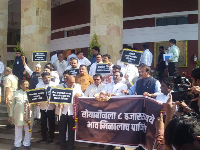 राज्यात कांदा निर्यातबंदीचा मुद्दा गाजत आहे. कांदा उत्पादक शेतकरी हतबल झाला आहे. या पार्श्वभूमीवर महाविकास आघाडीने सोमवारी विधानभवन परिसरात आंदोलन केले. याप्रसंगी, ‘कांद्याचा वांदा करणाऱ्या सरकारकचा धिक्कार असो’, ‘कांद्याची निर्यातबंदी हटवलीच पाहिजे’, ‘या सरकारचे करायचे काय, खाली डोके वरती पाय’, ‘कांद्याला भाव मिळालाच पाहिजे’, ‘हल्लाबोल हल्लाबोल, मोदी सरकारवर हल्लाबोल,’ अशा घोषणा देत परिसर दणाणून सोडला. आंदोलनात विधानसभेचे विरोधी पक्षनेते विजय वडेट्टीवार, माजी मंत्री अनिल देशमुख, भास्कर जाधव, बंटी पाटील, विश्वजीत कदम, सचिन अहिर, प्रणिती शिंदे, रवींद्र धंगेकर, ऋतुराज गायकवाड, वर्षा गायकवाड पाटील आदींचा सहभाग होता.