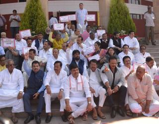 विरोधी पक्ष आमदारांच्या नागपूर विधानभवनाच्या पायऱ्यांवर बसून ‘मोदी हाय हाय’ घोषणा देत हल्लाबोल